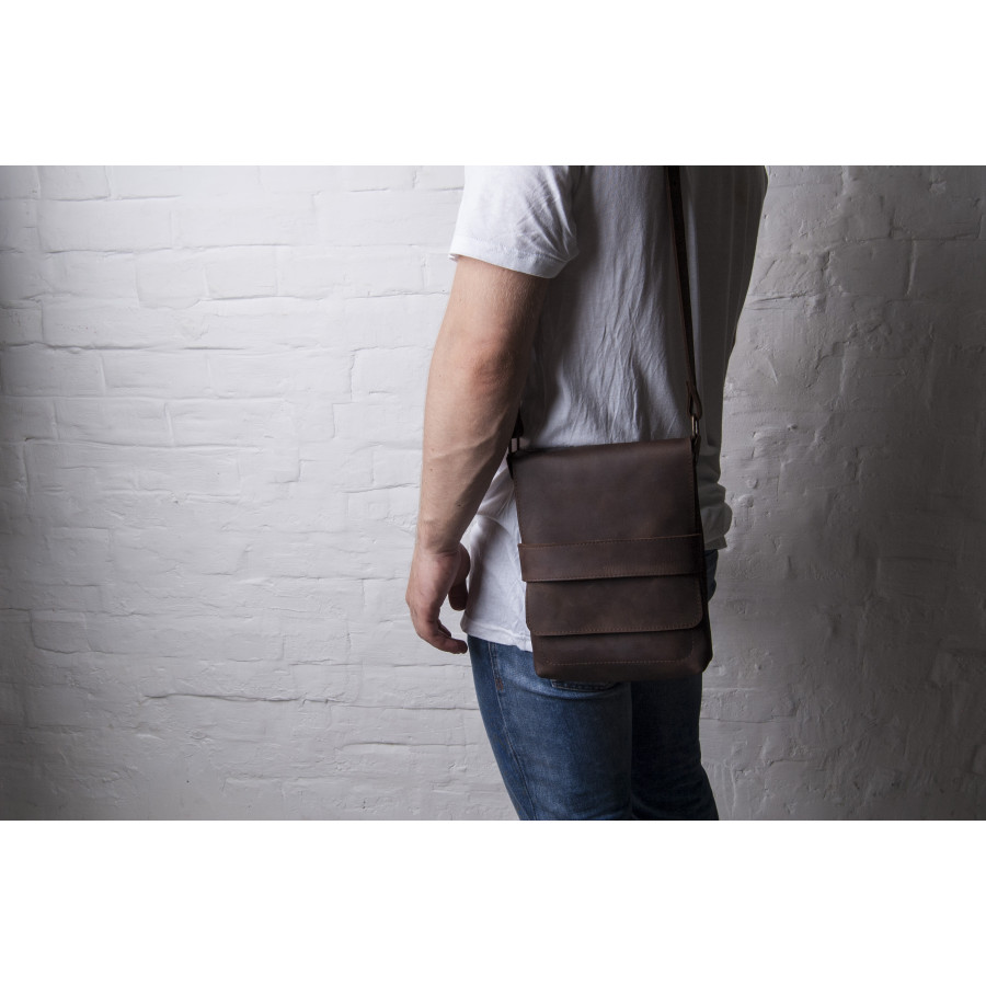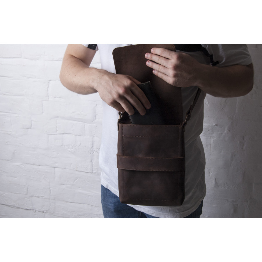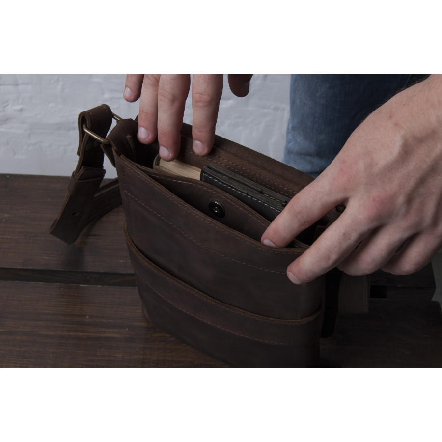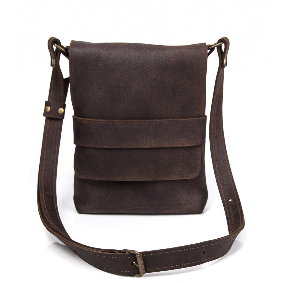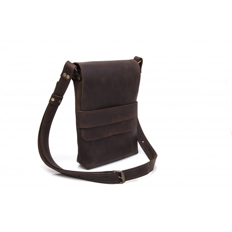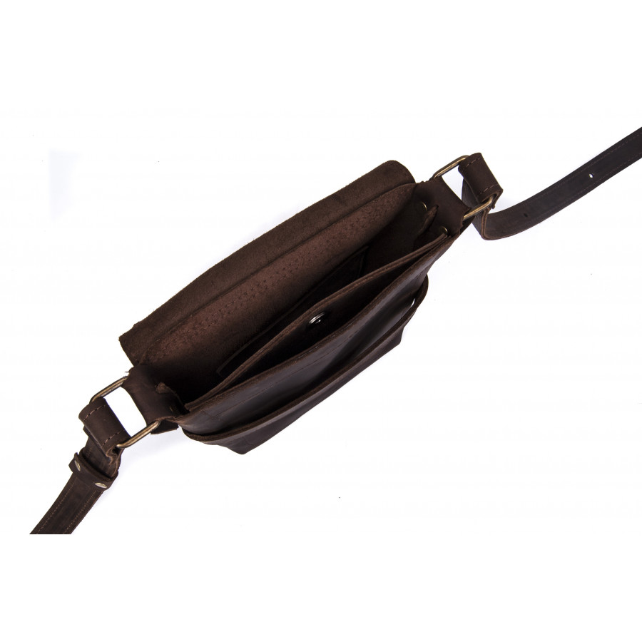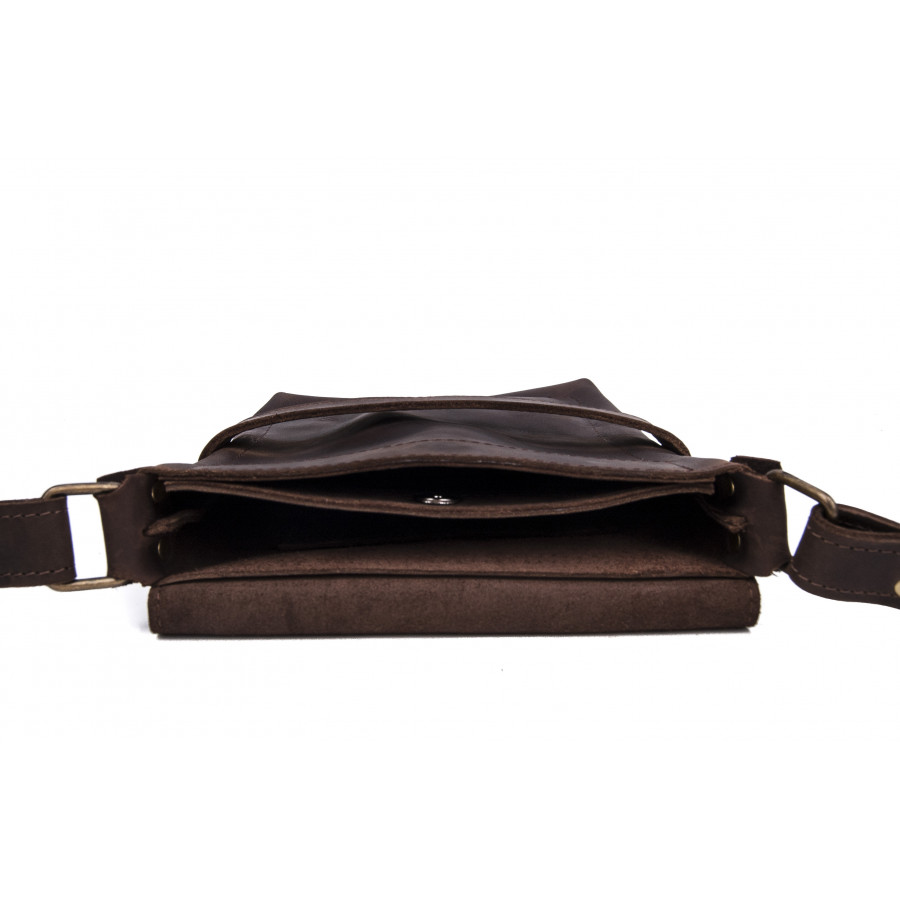 Стильная сумка небольшого размера. Основное отделение накрывается клапаном и фиксируется на кожаную ленту. Внутри карман на задней стенке и карман на передней стенке закрывается на кнопку. Размер: 22 х 18 х 7 см. Ширина ремня через плечо — 2,5 см.