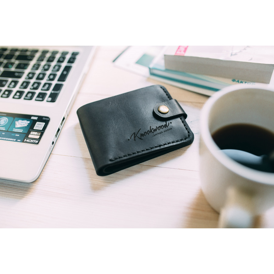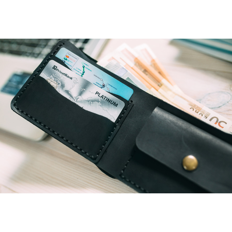 Два отделения для карт,одно отделение для купюр. Максимально компактный и вместительный. Фиксируется кнопкой. Изготовлен из матовой кожи крупного рогатого скота высшего сорта производства Турции. Толщина 1.6-1.8мм. Раскроен лазером. Размер 89*105мм в сложенном виде. 210*89 в раскрытом виде. Прошит плетеной нитью, седельным швом(вручную).
