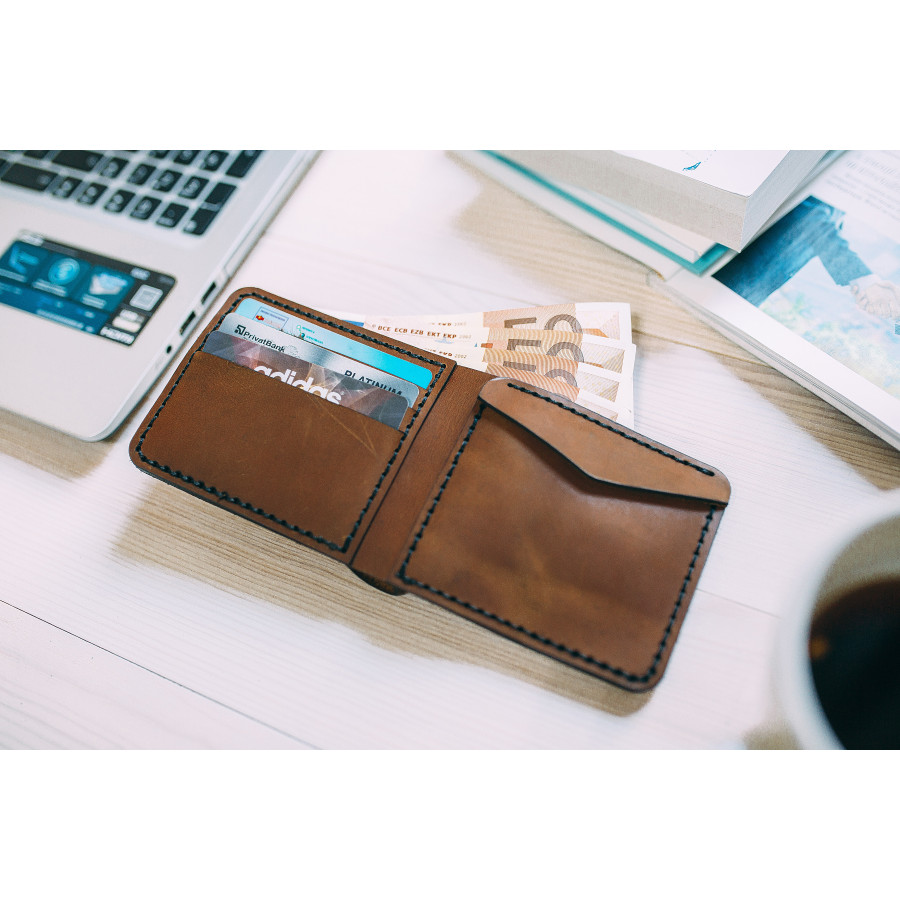 11.5*8.9 фикс, в раскрытом виде 8.9*22. Три кармана для карт. Карман для мелочи. Большое отделение для купюр, минималистический дизайн. Ручная прошивка. Кожа "крэйзи" крупного рогатого скота (бычок,корова), производства Турции.