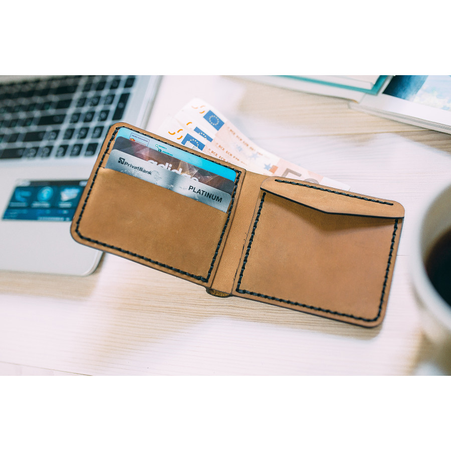 11.5*8.9 фикс, в раскрытом виде 8.9*22. Три кармана для карт. Карман для мелочи. Большое отделение для купюр, минималистический дизайн. Ручная прошивка. Кожа "крэйзи" крупного рогатого скота (бычок,корова), производства Турции.Торцы запечатаны, полирован.